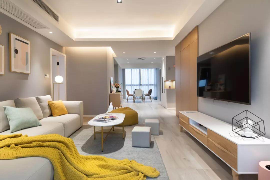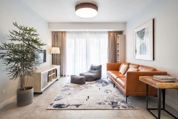 本案整體色系采用黑、白、灰、橙四種不同的色調,冷暖錯落,層次分明,讓空間色彩更加立體豐富,木色延續著這個空間的素雅,以溫和包容的方式帶來最大化的明快與利落。客廳整體以現代大方的空間氛圍,呈現出一個舒適大方的寬松空間感,地面灰色的地毯上擺一張圓形小茶幾,白色跟褐色棲的布藝沙發,營造一個簡約自然的氛圍感。了解更多設計+V:18077392735